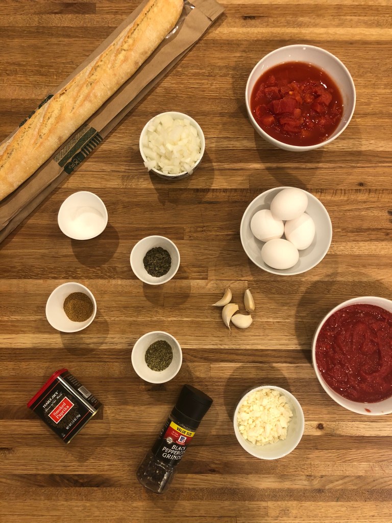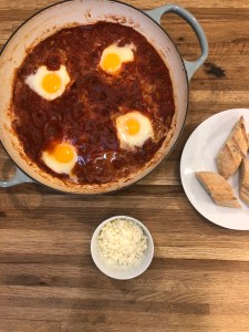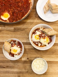 Eggs are a great breakfast – protein rich, easy to make, and very versatile. Why not take those scrambled eggs up a notch with this easy breakfast. This recipe is inspired by the classic Middle Eastern dish – Shakshuka – but with a few twists. The tomatoes and rich flavors come together for a warm, filing weekend breakfast. Add a crunchy baguette to soak up the runny yolk and tomato mixture and you’re sure to have a crowd pleaser!