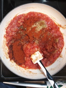 Step 3: Add the crushed and diced tomatoes and stir until combined. Next add in the paprika, cumin, basil, oregano, salt and pepper and stir until well mixed. Let sauce simmer for 8-10 minutes, stirring frequently to prevent burning. You want the sauce to be bubbling so to ensure it is well heated before adding the eggs.