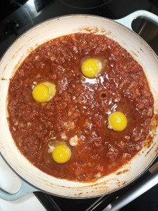 Step 4: Reduce the heat to low. Make four pockets in the tomato mixture for the eggs. Crack the eggs – careful not to break the yolk – in to the pan. Cover and allow to cook for 12-15 minutes, until the eggs are just set. The egg whites should be white , but the yolks still bright yellow. You should be able to shake the pan and the eggs will still be jiggly.
