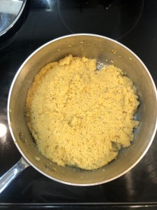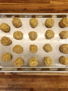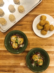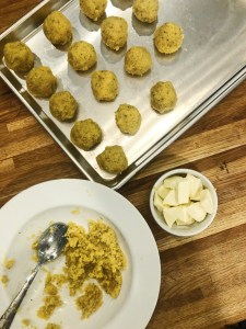 Step 4: When the sauce is about half way through cooking, start forming the balls. Remove the polenta from the refrigerator – take a large scoop (about 1/8 cup), make a pocket with your thumb and add a piece of mozzarella. Cover the mozzarella completely and form in to a ball. Repeat this step until all the polenta has been used. Should form about 18-20 balls.