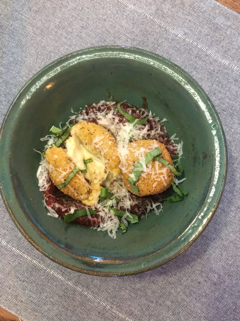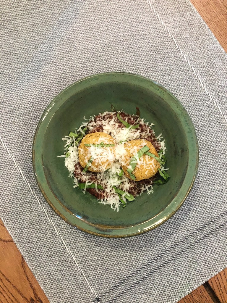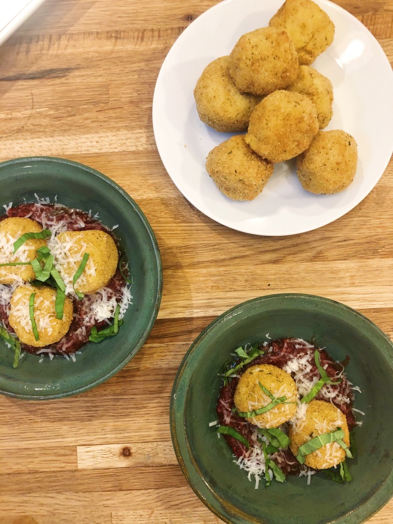 Spicy, cheesy, creamy – what more could you want from a dish?! This recipe is inspired by Arancini – an Italian fried rice ball. Polenta on its own is like a warm hug, but adding melty mozzarella, really brings it to a new level. I decided to make a spicy marinara to cut through all the creaminess this dish offers and to really give it a kick! Whether you’re serving this as an appetizer or as a meal, it will please even the pickiest eater! My husband has never been a fan of polenta, but he couldn’t stop eating these! That is how delicious this recipe is. Try it yourself! If you’re not too keen on spice, just omit the crushed red pepper flakes.