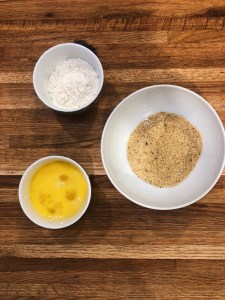 Step 5: Once all the polenta has been formed, place in the freezer for 15 minutes to begin to harden., this will help keep its shape. In the meantime, get 3 separate bowls for the eggs, flour and breadcrumbs.