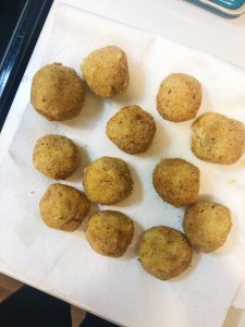 Step 7: While the balls are in the freezer, heat a deep pot of oil on high heat. You want the temperature to reach 350 degrees Fahrenheit before you being frying. Once the oil is hot, add the balls to the oil – but make sure to not over crowd or they will not fry evenly (I did 3 balls per batch). Fry each batch for 5-7 minutes, until they are golden brown. Remove from the oil and place on a paper towel to soak up any excess oil.