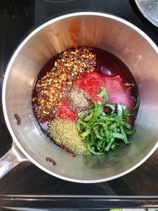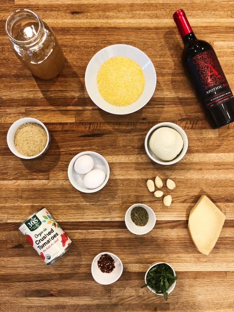 Step 3: While the polenta is cooling, in a medium pot add the crushed tomatoes, wine, red pepper, fresh basil, remaining oregano, remaining minced garlic, 1 tsp salt and 1/2 tsp pepper – adjust salt and pepper to taste. Simmer on low heat for 1-2 hours, stirring frequently. This will allow the flavors to combine and make the sauce very delicious! If you’re in a crunch for time, you can combine all the ingredients and simmer long enough to heat it up – but I promise, it’s worth the wait.