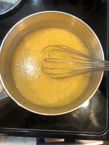 Step 1: In a large pot, add the vegetable broth and bring to a boil. Once boiling, reduce to low-medium heat, add the polenta and whisk constantly until thickened. You want the polenta to be thick so it will hold together when frying.