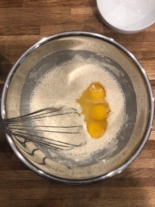 Step 3: Add in the eggs and whisk until well combined. set the batter aside until you are ready to use. You do not want to add the sparkling water until you are ready to cook!