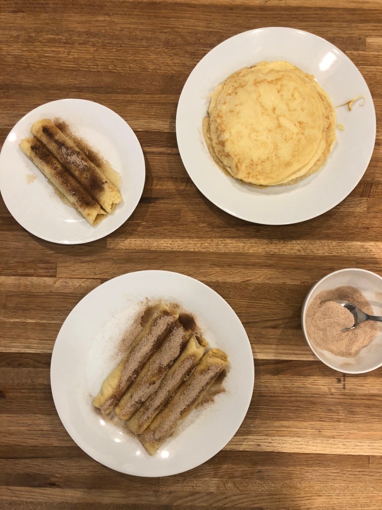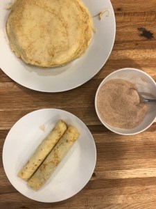 Step 9: Add more butter and cinnamon sugar on top of the rolled pancakes. Serve and enjoy!!