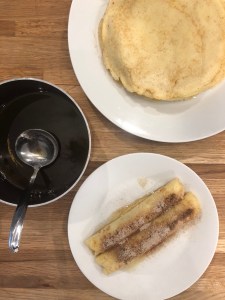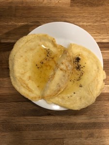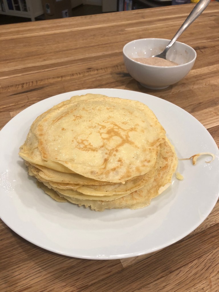 Eierkuchen is a popular dish throughout Germany. They are a cross between a crepe and a pancake – they are slightly thicker than crepes but not as fluffy as pancakes…still equally delicious though! They are typically topped with browned butter and cinnamon sugar, but jam can be substituted for a lighter version This dish is especially popular during the holidays. My husband and his family grew up in Germany and this is one of his favorite German recipes to eat – this recipe is also a family recipe from his mother and grandmother. I first had this recipe when my husband and I had just started dated. I had never heard of it but it sounded delicious, so he whipped me up a batch one weekend after I got off a nightshift. When I told his mother that he made it for me she replied that I must be a very special because this isn’t something he would make for just anyone! While we can’t travel right now, we hope this brings you a taste of Europe without leaving your house! These pancakes are warm and have a deep nutty flavor from the browned butter. Sprinkle with as much (or little) cinnamon sugar as your heart desires. Since the pancakes themselves are not sweet, they perfectly balance the cinnamon sugar so it does not taste like you are just downing a ton of sugar for breakfast. I invite you to try this recipe with your family and hope you find it as delicious as we do!