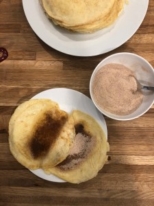 Step 7: Add a spoonful (or two!) of the cinnamon sugar on top of the butter down the middle of the pancake.