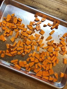 Step 1: Heat the oven to 400 degrees Fahrenheit. While the oven is preheating, dice the sweet potatoes. Arrange on a baking sheet and drizzle with oil and sprinkle with salt. Place in oven and roast for 20 minutes until tender.