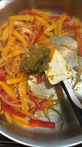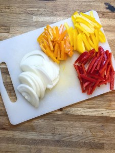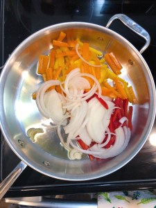 Step 3: Heat a large pan over medium to high heat. Add 2 tbsp oil and add the bell peppers and onion. Cook until they begin to caramelize – about 10-15 minutes.
