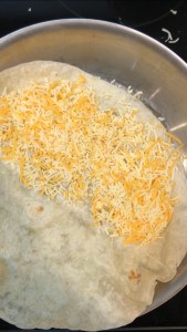 Step 7: In another large pan (you need a pan big enough for your tortilla to lay flat my pan was barely big enough), heat 1 tbsp oil over low to medium heat. Add 1 of the tortillas and 1/3-1/2 cup of cheese to half of the tortilla.