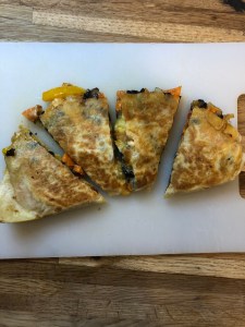 Turn off heat and remove quesadilla from pan. Cut each quesadilla in to four pieces and serve with favorite toppings!