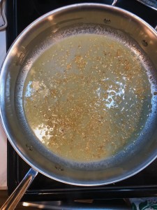 Step 6: When the potatoes have about 10 minutes left, heat a large pan over high heat. Melt the butter. Add the garlic and stir until fragrant.