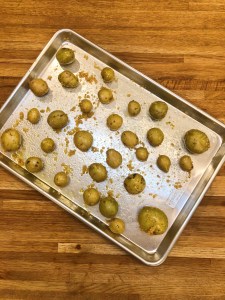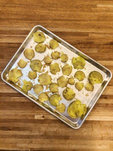 Step 5: Using a glass cup (or another flat object), gently press down on each potato so it becomes smashed. This will allow them to crisp in the oven. Spread 2 tbsp of the minced garlic amongst the tops of the potatoes. Place in the oven and cook for 25 minutes.