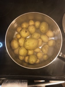 Step 2: Once the water is boiling, add the potatoes. Cover and cook until the potatoes are tender – about 20 minutes.