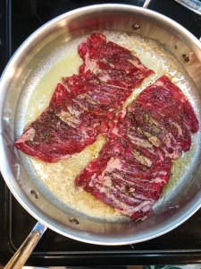 Step 7: Add the steak to the pan and sear on each side. Reduce heat to medium and continue cooking steak until it reaches desired internal temperature – about 3 minutes on each side for Medium Rare. For less pink steaks, cook longer.