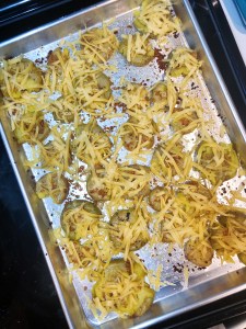 Step 9: Once the 25 minutes are up for the potatoes, remove from the oven and top with the gouda cheese. Place back in the oven for 3 minutes, until cheese is melty.