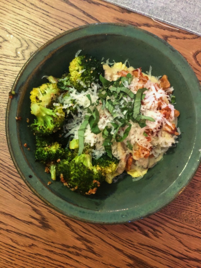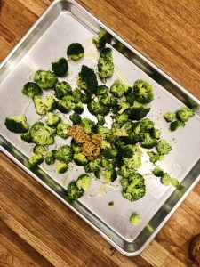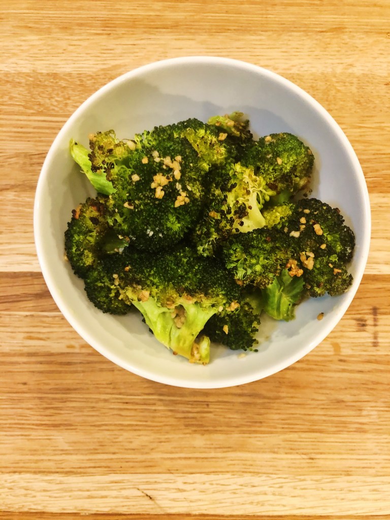 Step 2: Spread the minced garlic over the top of the broccoli. Place in the over and roast for 15 minutes. remove from the oven and enjoy! Serve with your favorite dish, or by itself. We served this with my Creamy Mushroom Chicken and it was delicious – link for recipe here.