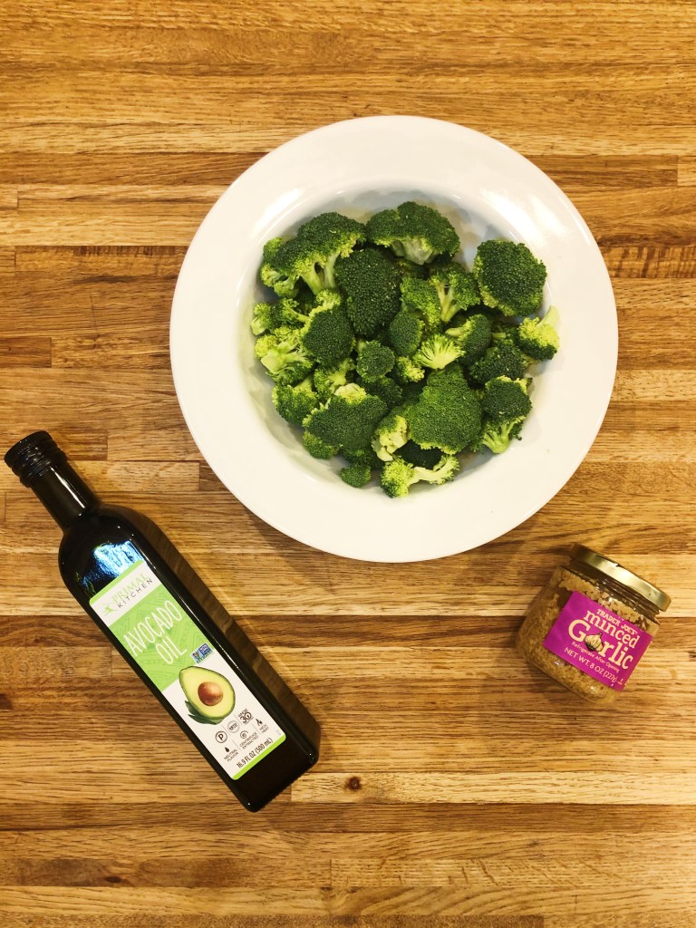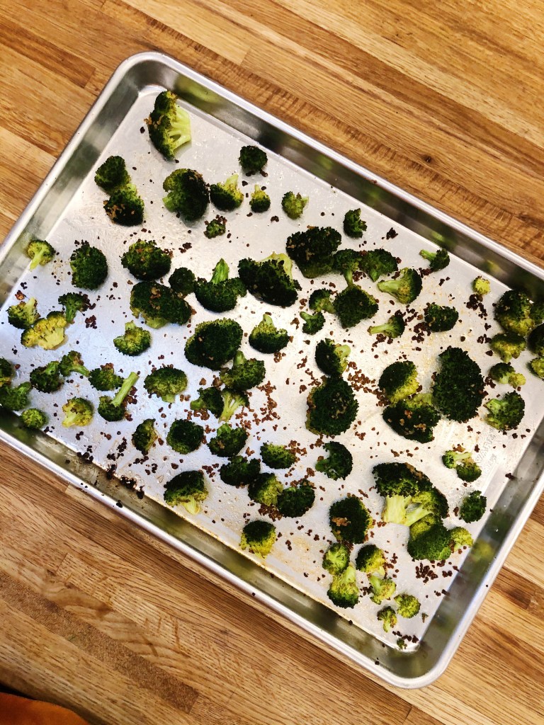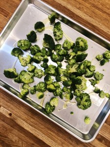 Step 1: Heat the oven to 400 degrees Fahrenheit. Arrange broccoli on a sheet pan. Drizzle with olive oil and sprinkle on the salt and pepper. Using your hands, toss the broccoli to make sure the olive oil and seasonings are evenly spread.