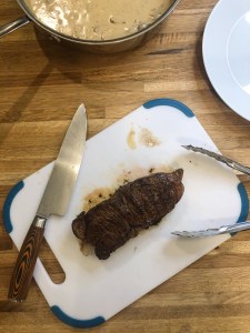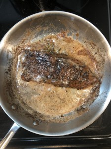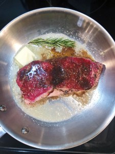 Step 12: Flip steak to sear on the other side for 2 minutes. Reduce heat to medium-low to avoid burning the steak while continue to cook. Cook steak to desired internal temperature – for medium rare you want an internal temperature of 130 degrees Fahrenheit.