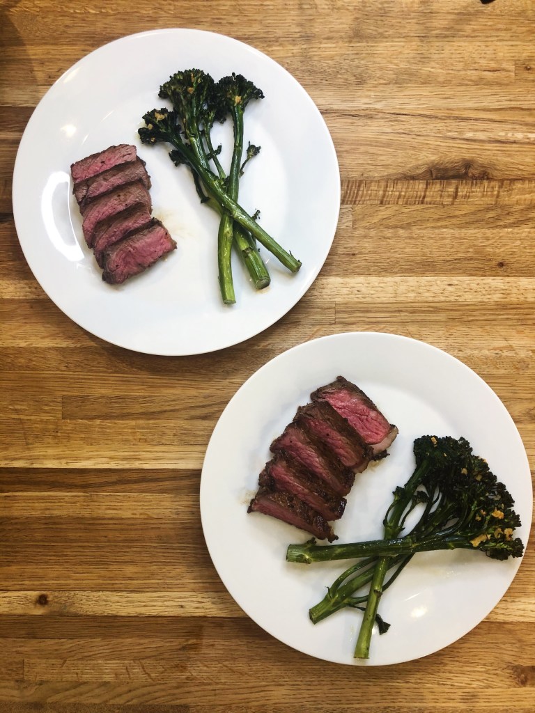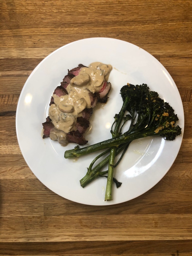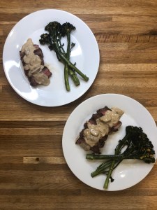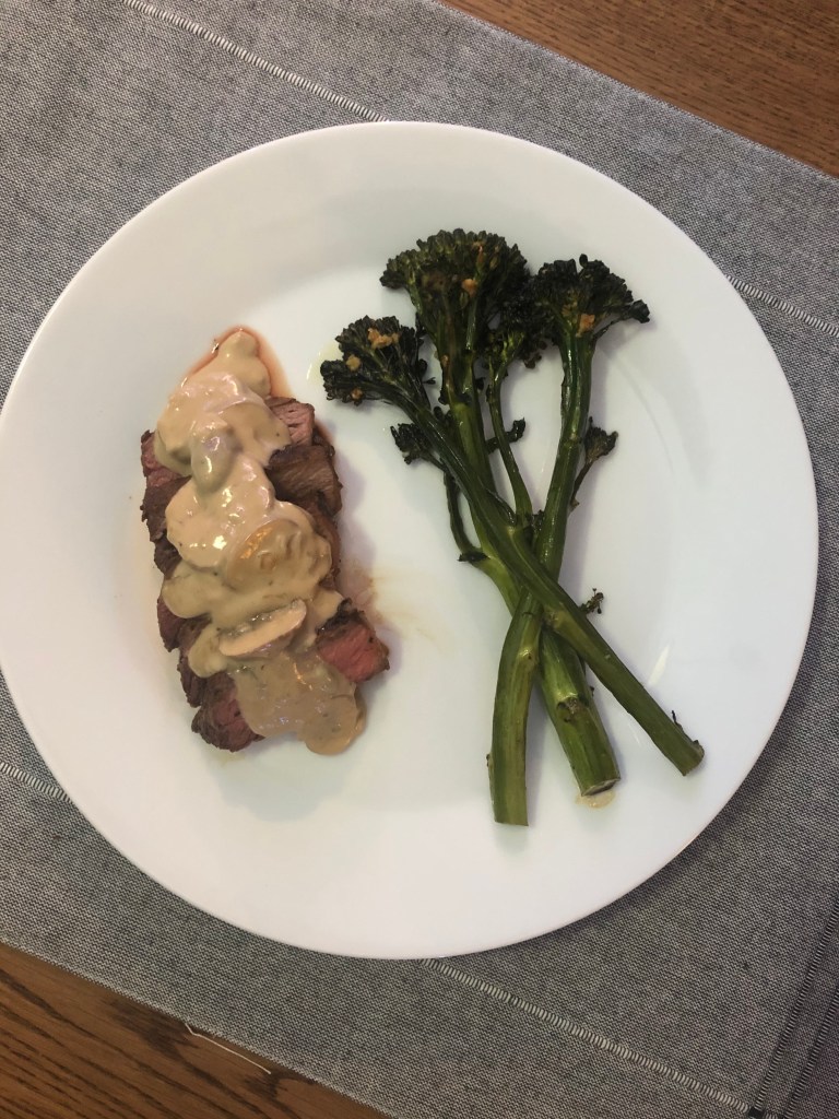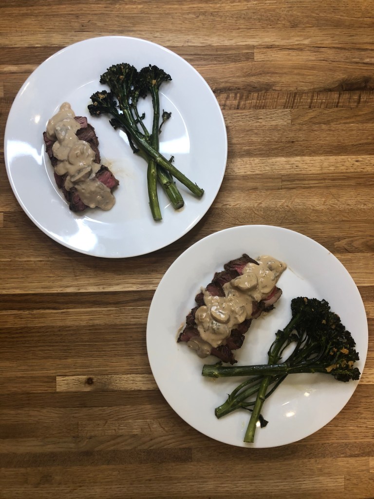 Slice the steak and divide between plates. Top with the balsamic bleu cheese sauce and enjoy! I served with a side or roasted broccolini with garlic!