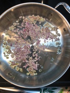 Step 2: Heat a large pan over medium heat. Add the oil and heat. Once heated, add the shallots and sauté for 3-5 minutes until translucent. Add half of the minced garlic and stir until fragrant.