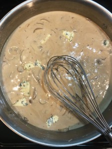 Step 9: Crumble the bleu cheese and add. Continuously stir until the cheese is melted and well combined. Turn off the heat and cover to keep warm until ready to serve.