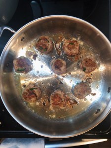 Step 5: Heat a large pan over medium heat and add the oil. Allow the oil to heat before adding the meatballs. You will want to cook the meatballs in batches so you do not overcrowd the pan – I cooked 6 – 8 per batch.