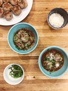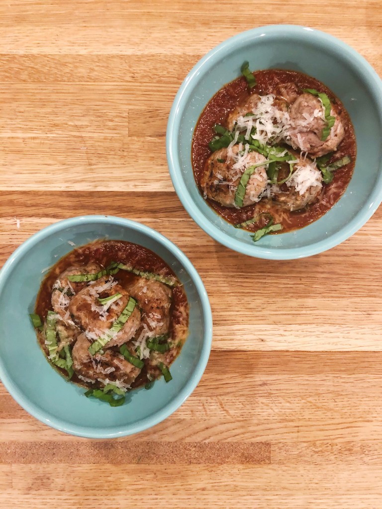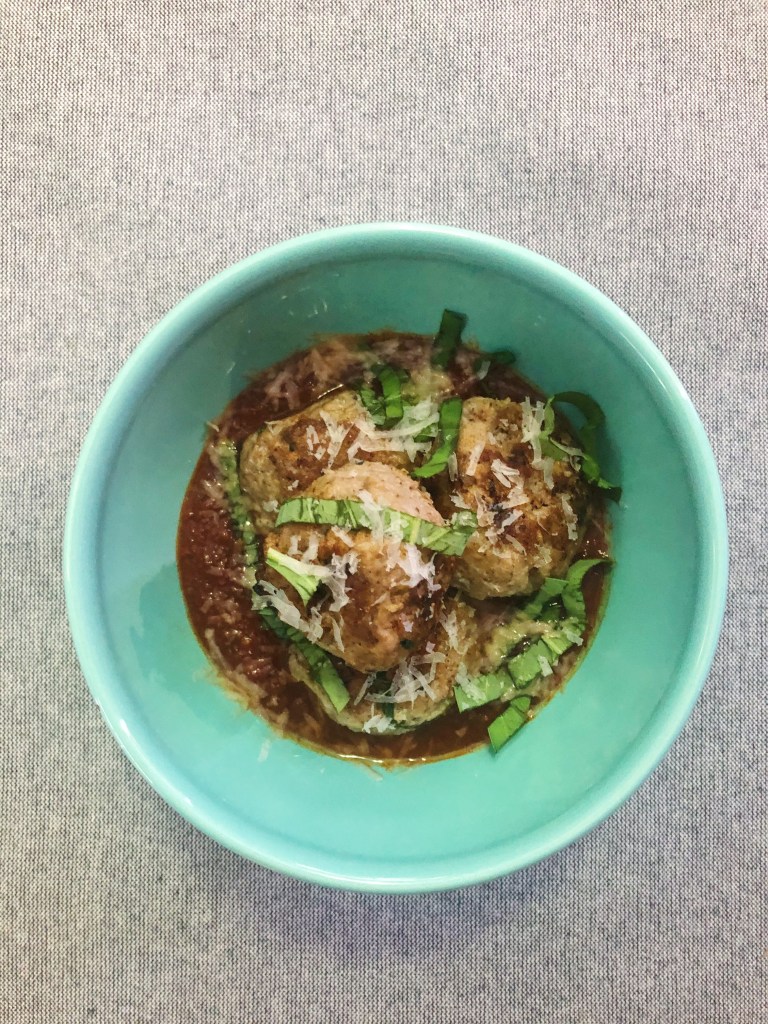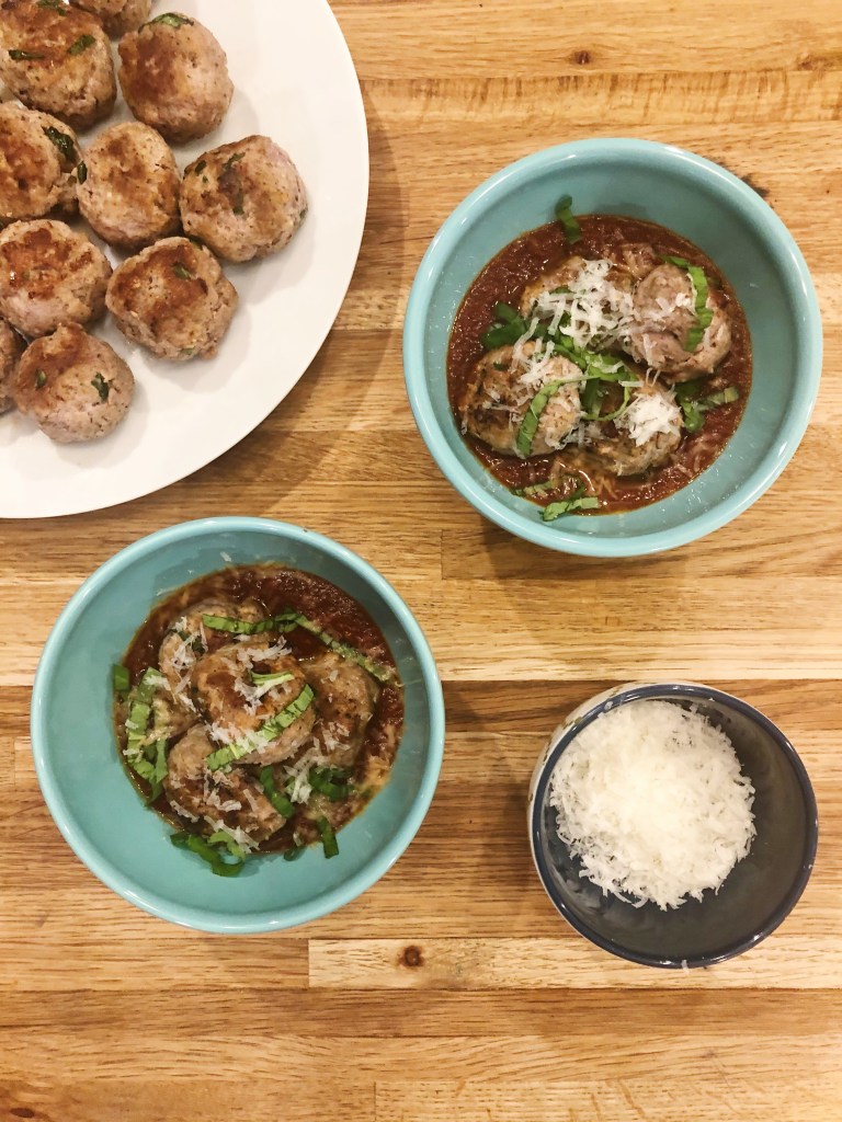 Step 7: Divide the meatballs in to dishes and serve with sauce, veggies, or pasta of choice! Top with basil and fresh parmesan and enjoy!