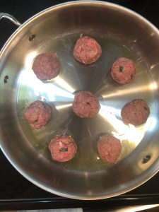 Step 6: Once the oil is hot, place the meatballs in the pan and sear for 1 minutes. Flip the meatballs to sear on the other side. Reduce to low heat and cover to cook the inside. Repeat until all meatballs have been cooked.
