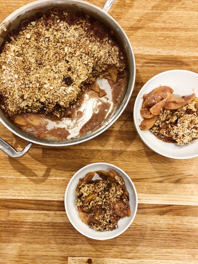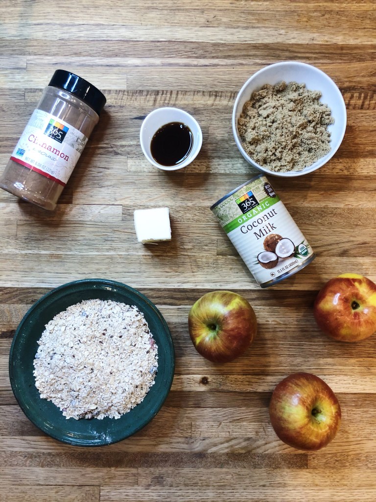 Not only is this recipe warm and comforting, it is also fairly healthy! I love apple pie and apple crumble but it can get heavy and sugary quickly. This is a lighter version that is equally delicious. My husband actually turned me on to this combination but I made a few upgrades! He used to make this when he wanted something sweet but not overly indulgent. The apples cook in a can of coconut milk which make them tender. The coconut milk adds a rich, creaminess with a natural sweetness. I topped the apples with an oat and brown sugar topping to give it an extra edge! The plan was to use steel cut oats, but my pantry had other plans. I ended up using a protein oat, chia, hemp seed mixture that was in my pantry from Purely Elizabeth, but rolled oats will do the trick!