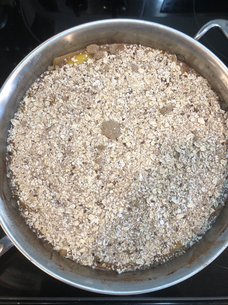 - Once the apples are softened turn off the stove and add the crumble topping on top. Place in the oven and bake for 20-25 minutes until the apples and coconut are bubbling and the topping has turned golden brown. Remove from the oven and let set for 5 minutes. Serve and top with your favorite ice cream!