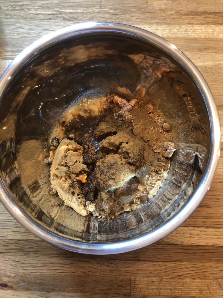 - In a medium mixing bowl add the melted butter, oats, brown sugar, 1 tbsp vanilla and 1 tbsp cinnamon. Stir until well combined.