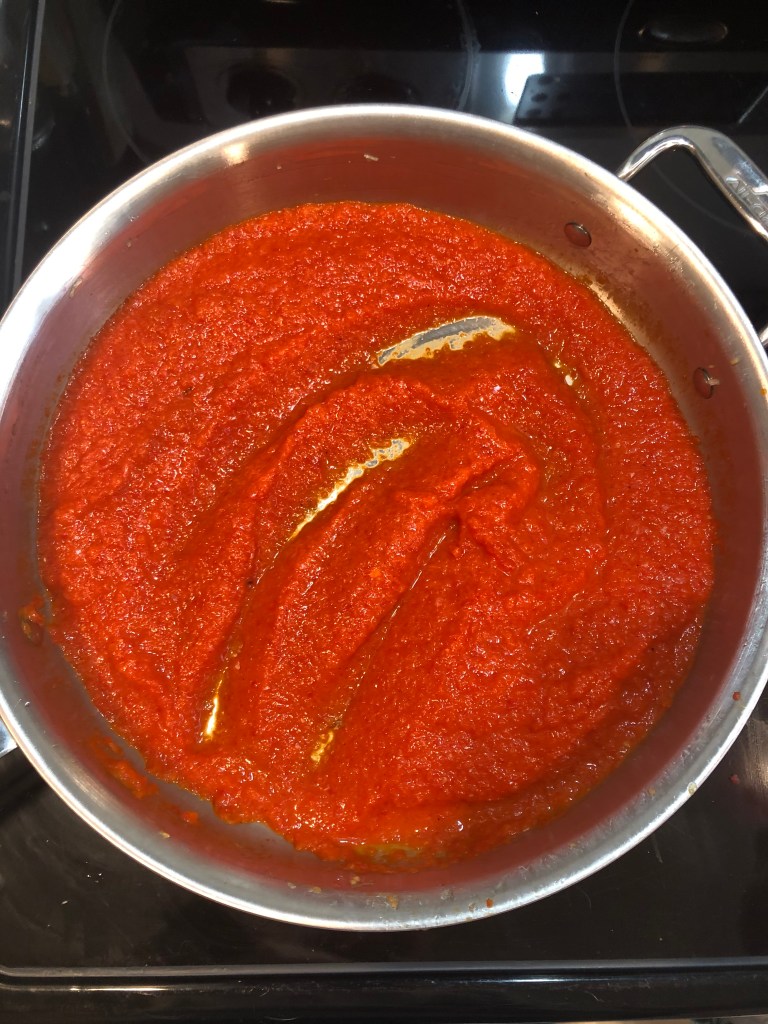 - Pour the blended peppers back in to the pan and reduce to low heat.