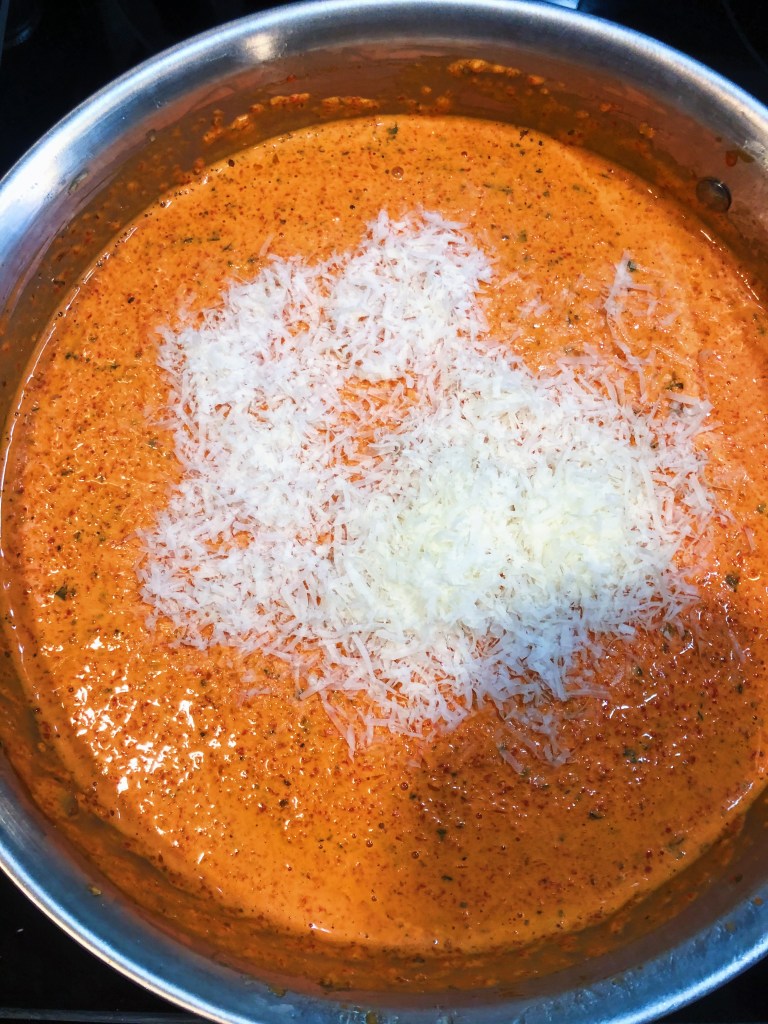 - Stir in the pasta until the pasta is well coated in the sauce. Serve and top with more parmesan and enjoy!