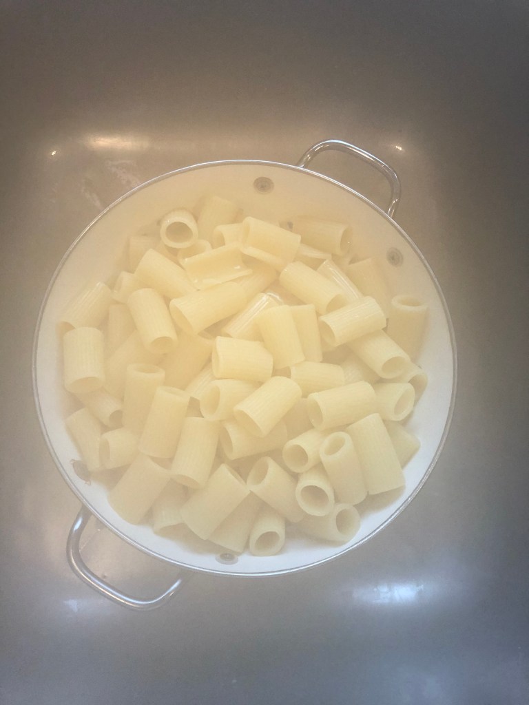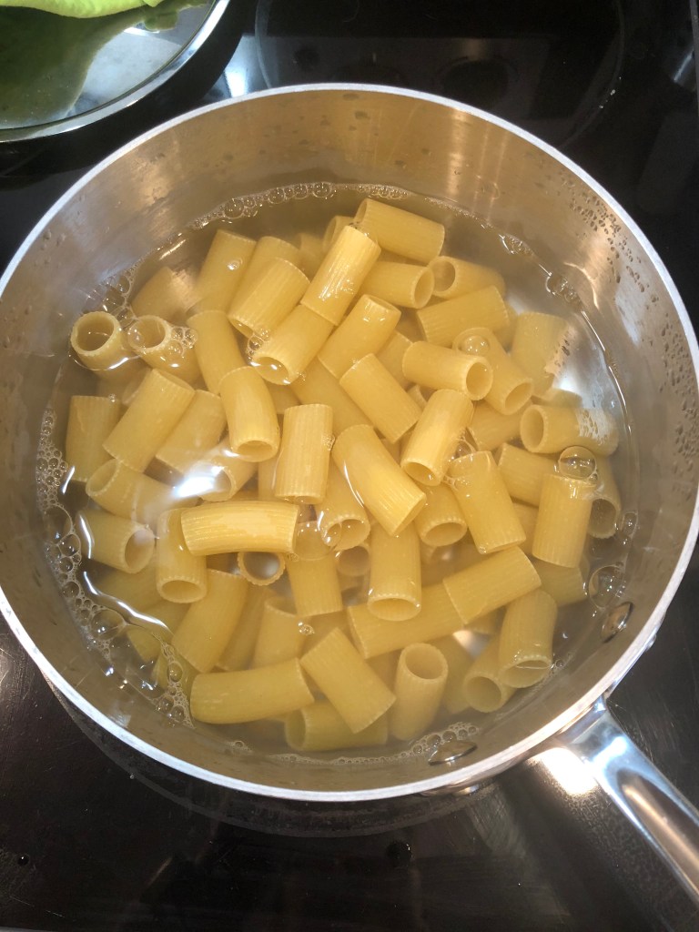 - Generously salt a large pot of water and bring to a boil. Once boiling, add the pasta and cook until al dente – about 8-10 minutes. Once the pasta is cooked, drain and set to the side.
