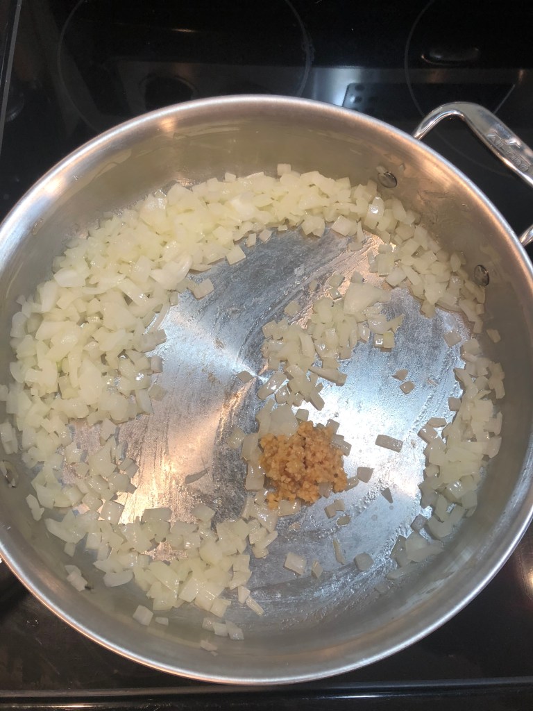 - Once hot, add the onion and cook until softened -about 5 minutes. Add in the garlic and cook for another 3 minutes.