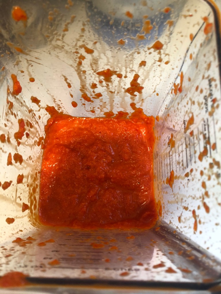 - Drain the liquid from the red peppers. Add the peppers to a blender then add in the onions and garlic.