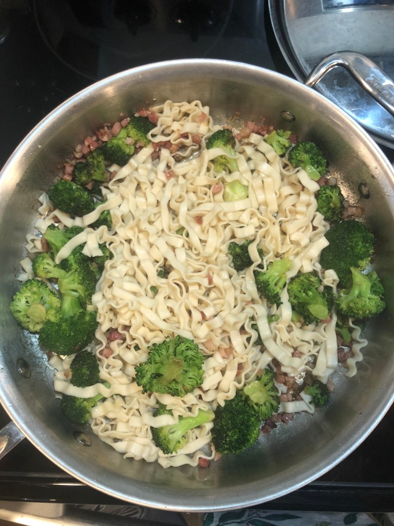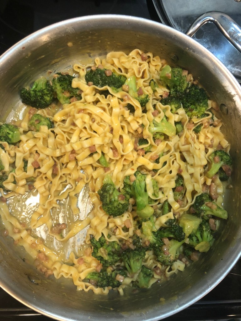 - Once the noodles are done cooking, add them to the pan and turn the heat off. Toss the noodles with the pancetta and broccoli.