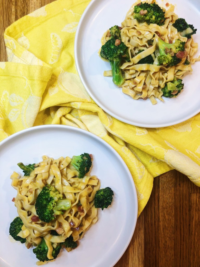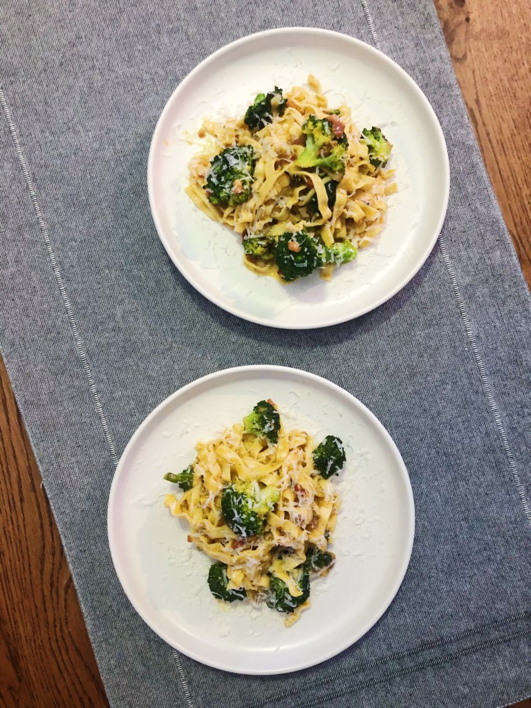 If you have never had fresh carbonara, I urge you to. It is one of my favorite pasta dishes to make from scratch, but it can be very time consuming. That is where this dish comes in – a dressed up, easier, asian fusion “carbonara.” It starts with easy ramen noodles that cook up in no time, combined with a salty miso paste and spicy sriracha. It still has all the classic elements of carbonara – pancetta, eggs, and pecorino – but the asian ingredients really take it up a notch. The broccoli also adds a lightness and a bite to diversify the texture in the dish – not to mention that pop of color! The hardest part to nail, as with any carbonara, is the sauce – if the heat is too high the eggs will scramble, and if its too low the sauce won’t thicken and come together. Try this for a unique twist on a delicious classic, and you will love it so much you might ditch the handmade pasta for ramen!