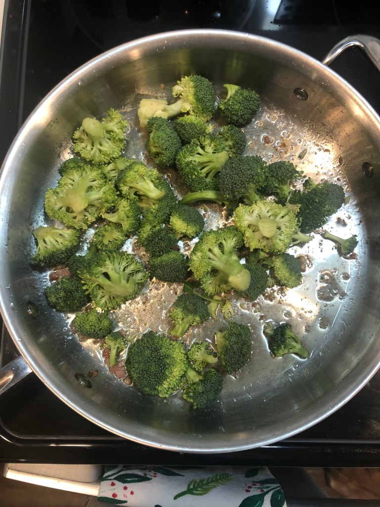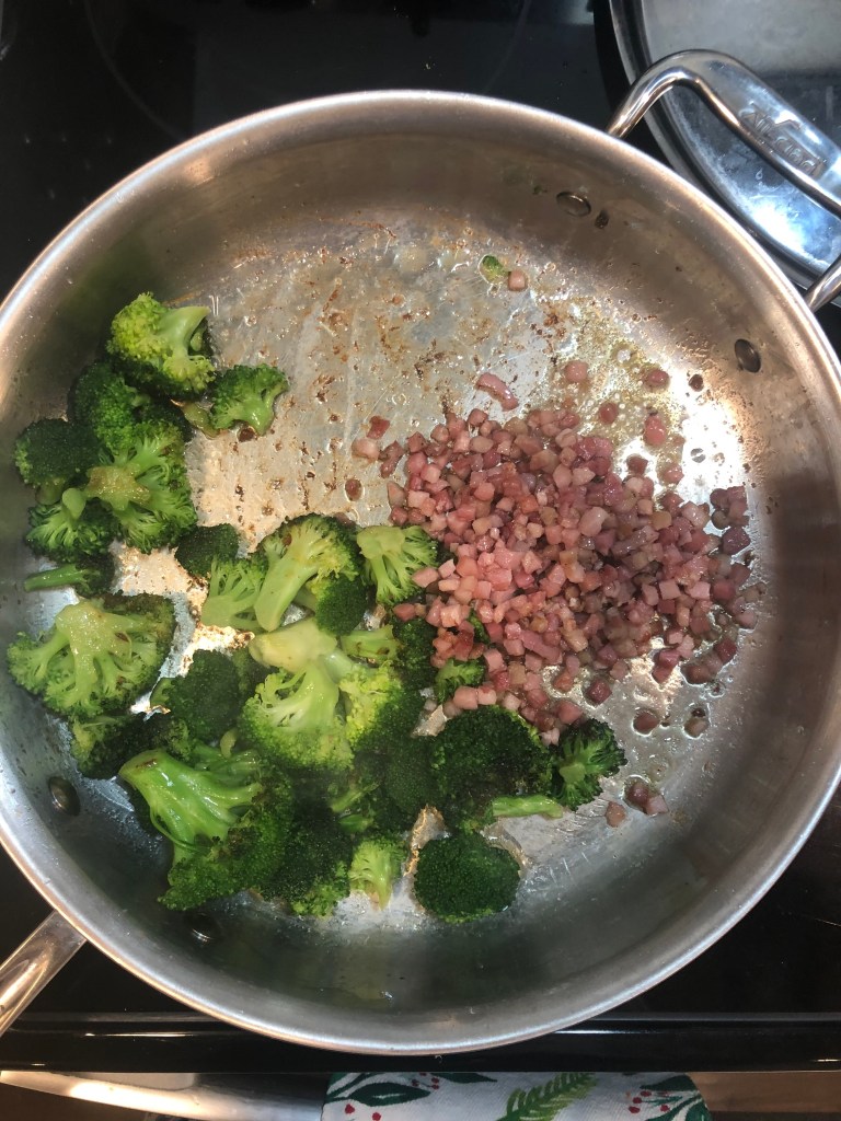 - Return the pancetta to the pan with the broccoli and reduce the heat to low.