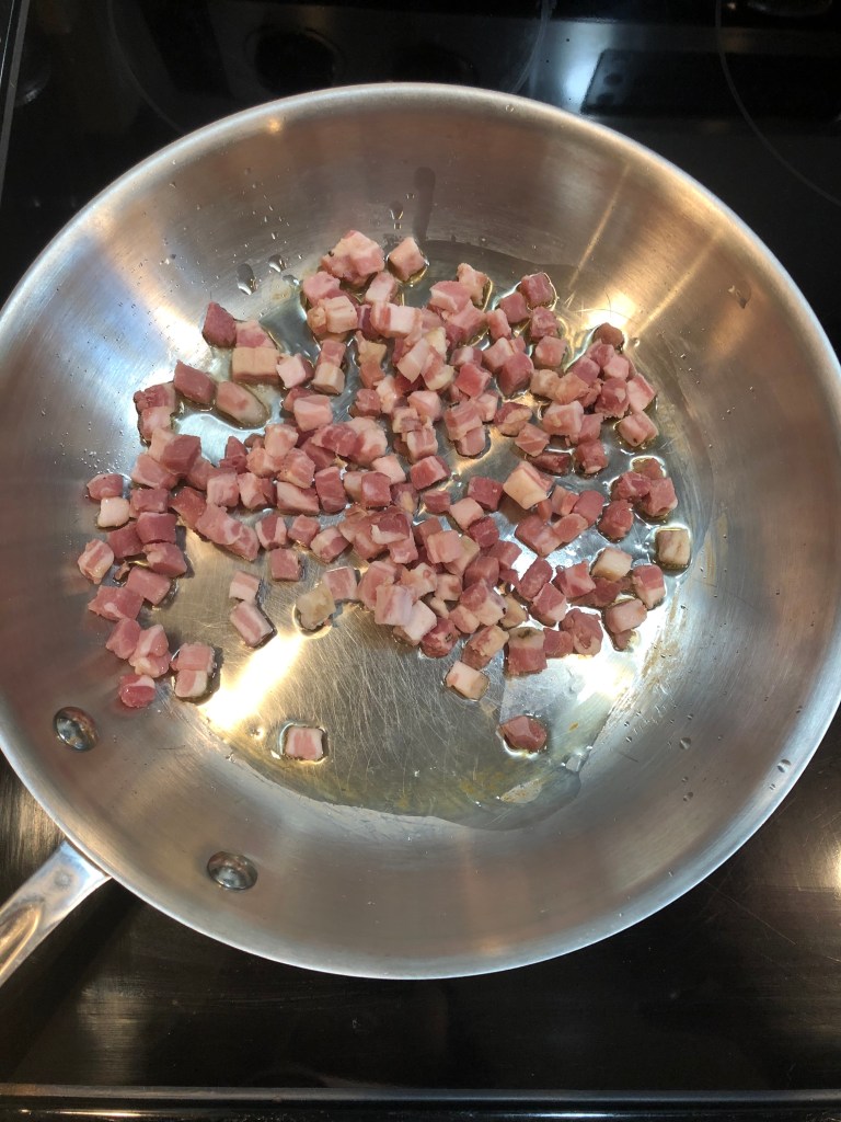 - While you are waiting for the water to boil, heat a large pan over medium heat and add the oil. Once heated, add the pancetta and cook until the pancetta begins to brown – about 5-8 minutes.