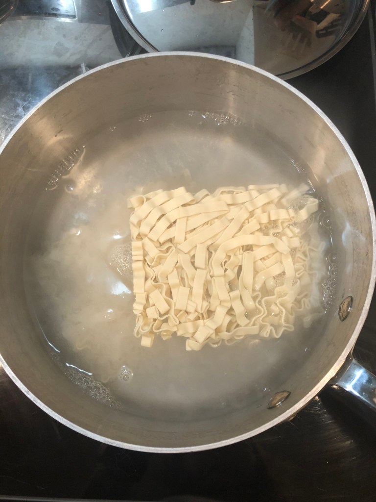 - By this point, the water should be boiling – add the noodles and cook according to the package instructions – about 3-5 minutes for them to become soft.