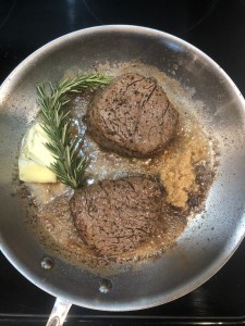 Step 10: Once the steaks are seared on all sides, reduce the heat to medium-low and add the remaining butter and garlic as well as the rosemary. Allow the steaks to cook until they reach the desired internal temperature. For medium rare you want them to reach 130 degrees Fahrenheit. For medium rare, pull the steaks off the pan when they reach between 120 and 125 degrees Fahrenheit to let them rest for 5 minutes before serving.