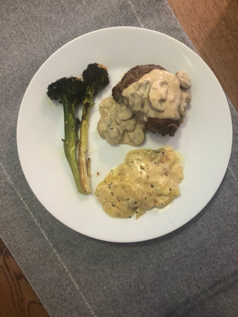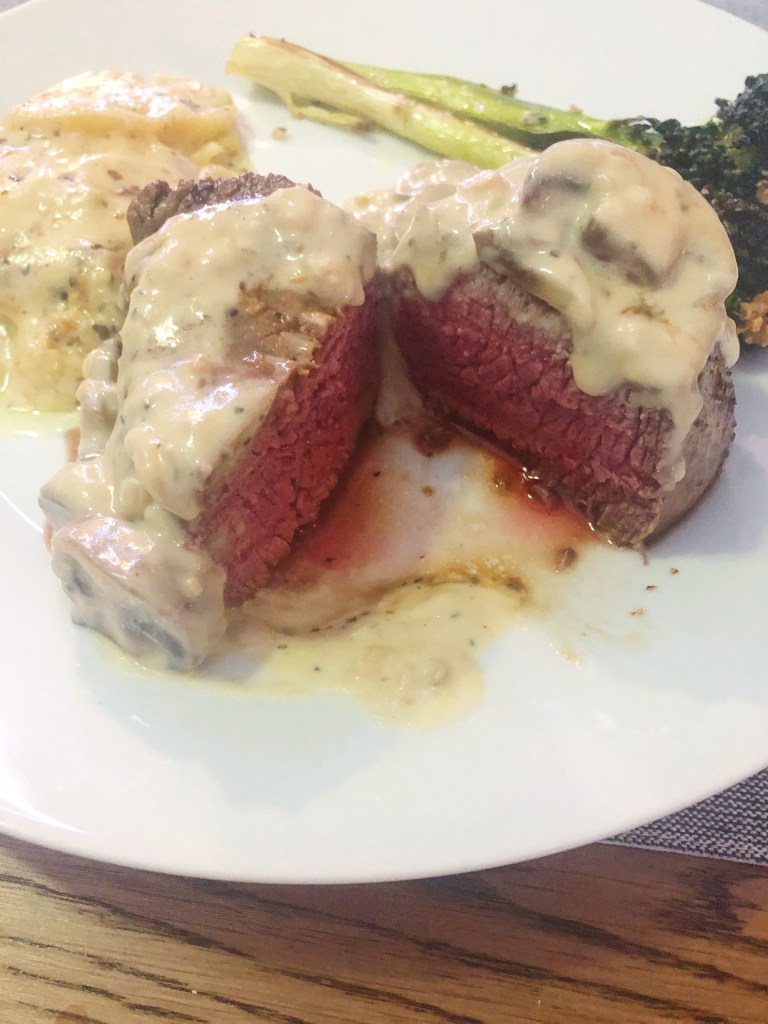Filet Mignon is my favorite cut of steak. It gets a bad wrap though for not being flavorful enough due to the lack of fat in the cut. While I might agree on some points, the filet is one of the most tender cuts and if prepared correctly can actually be very flavorful! This recipe will convert you to a Filet fan, if you aren’t already. The mushroom sauces adds a rich, creamy flavor on top the already perfect filet – but let me tell you, the filet can stand on its own here too!
