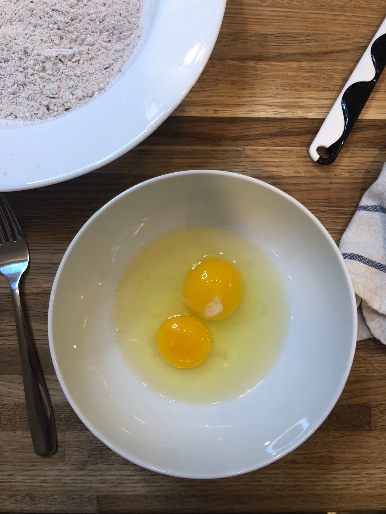 - In the first bowl, whisk together the eggs and milk. Set aside.