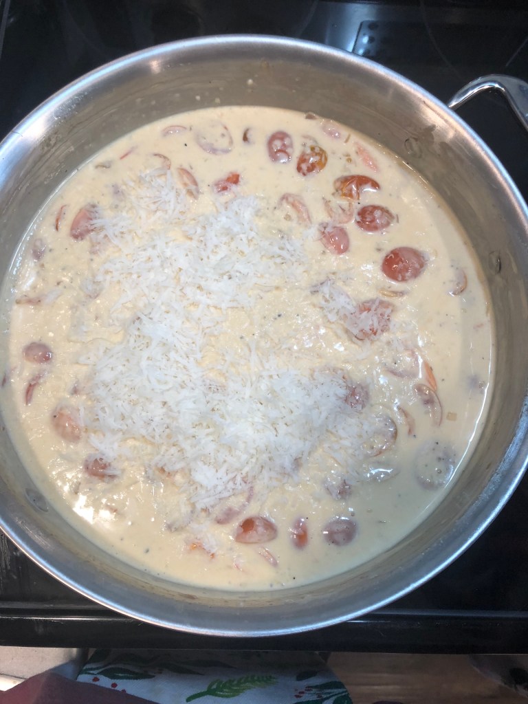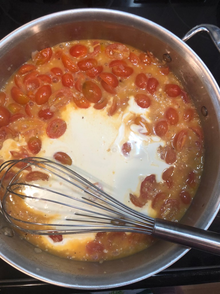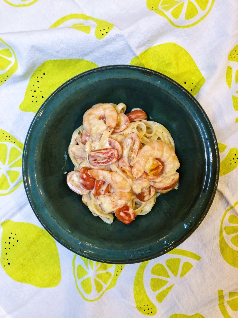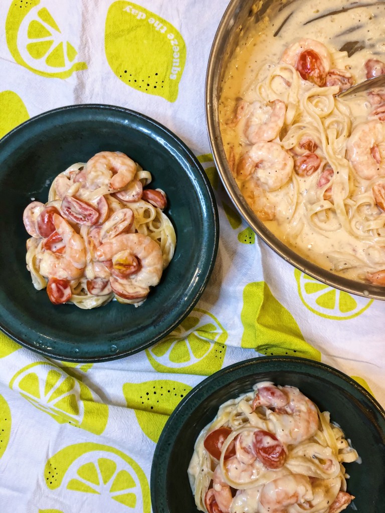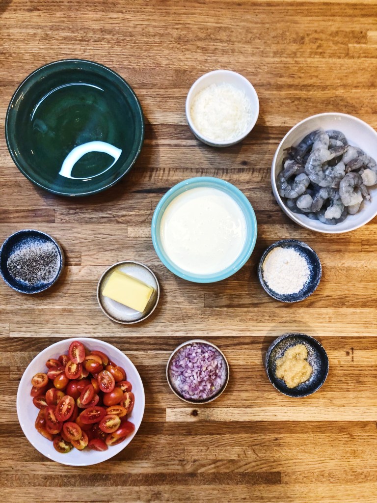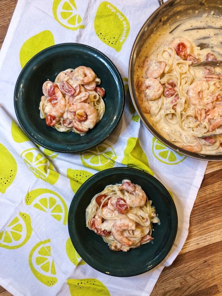 Shrimp – so delicious, so easy, so versatile. This dish came to light because I had some shrimp I needed to use and some cherry tomatoes that were about to see better days. I didn’t really plan this dish, just kept finding items in the fridge to clean out and all of a sudden this masterpiece was created. This is similar to an alfredo sauce with the cream and cheese, but the blistered tomatoes really add another dimension of flavor and texture and help lighten the sauce. This dish is just as indulgent as an alfredo, but feels a lot lighter and fresher – perhaps its the tomatoes or the shrimp? Either way, you should make this because I promise, you will not be disappointed. Also, the shrimp and sauce are delicious on their own and do not have to be served with noodles. This would be just as delicious over a noodle alternative or some roasted broccoli – or even just by itself!
