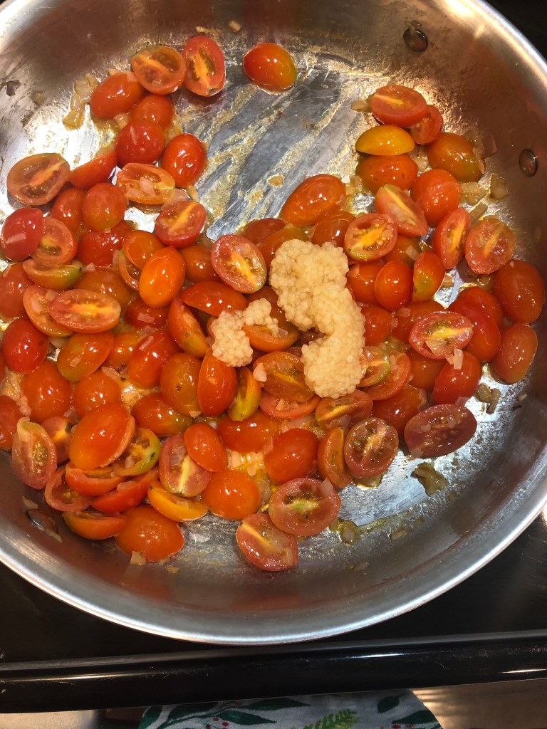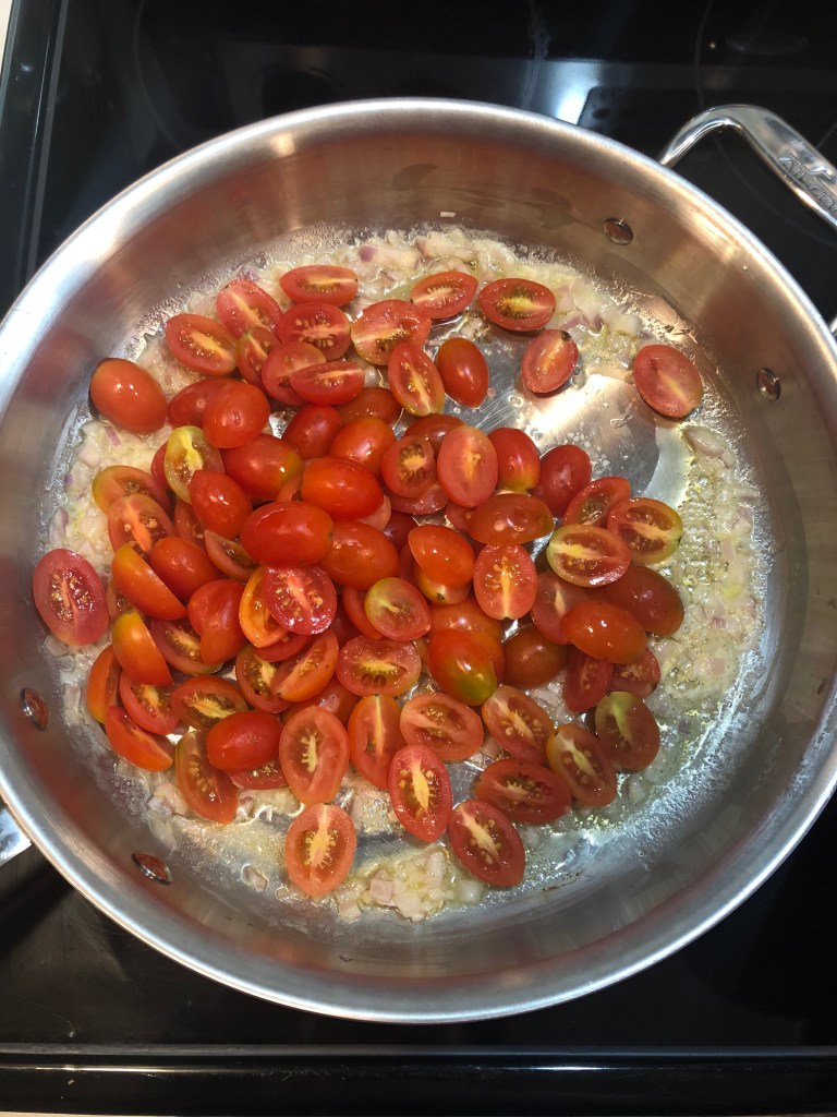 - Add in cherry tomatoes and cook down for 10 minutes. Sprinkle in about 1 tsp salt and 1/2 tsp pepper and stir well.