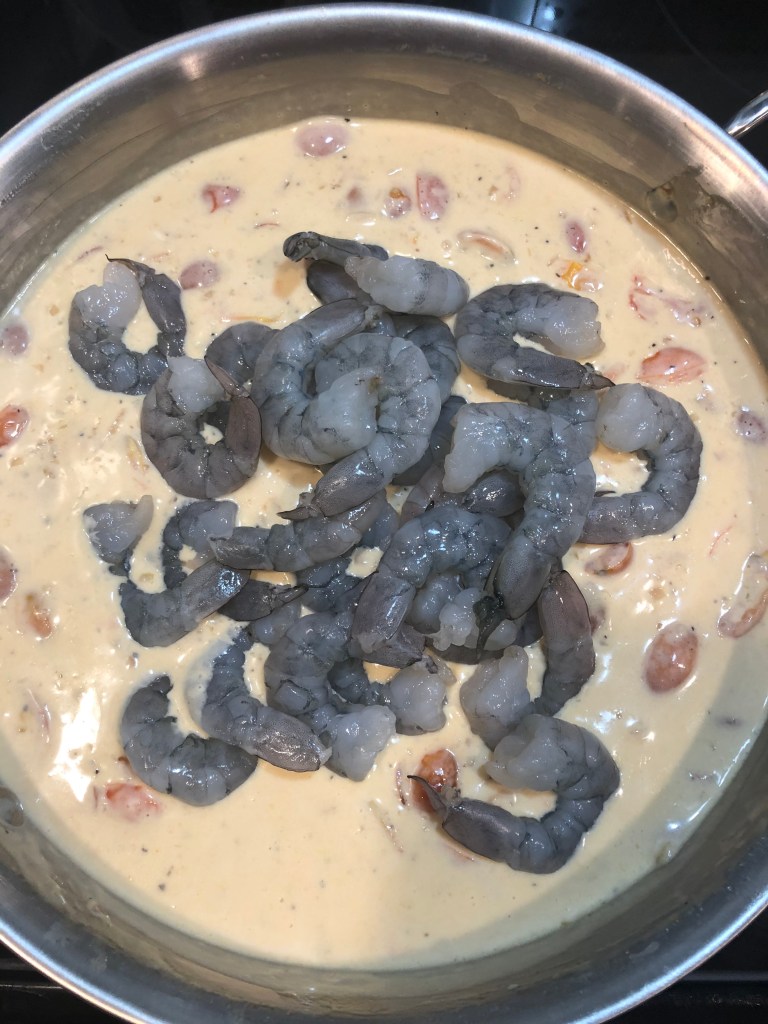- Add in the shrimp and cook for 5 minutes until the shrimp are pink!